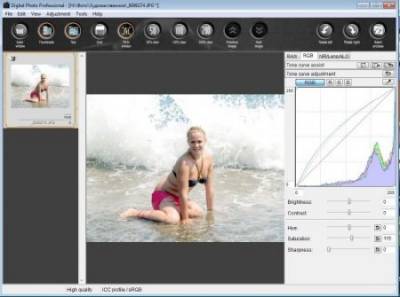 Функции: поддерживаемые форматы: CR2, CRW, TIFF/TIF, JPEG JPEG/JFIF настройки RAW файла: настройка баланса белого, настройка яркости (экспозиции), контраст, динамический диапазон, рецепты ".vrd", пакетная обработка ретушь RAW/JPEG/TIFF: кадрирование, штамп, тоновая кривая, цвет, насыщенность, яркость, контраст кривой тонопередачи, ретушь. Инструменты редактирования изображений кадрирование и штамп позволяют без дополнительных графических редакторов получать "готовый" продукт. В данном случае инструмент "штамп" использовался для того, чтобы "удалить" пылинку с матрицы. Место, откуда берется экземпляр для ретуши может перемещаться синхронно за курсором или быть фиксированным. Для полноты не хватает только инструментов исправления геометрических искажений (перспектива, дисторсия) и хроматических аберраций.