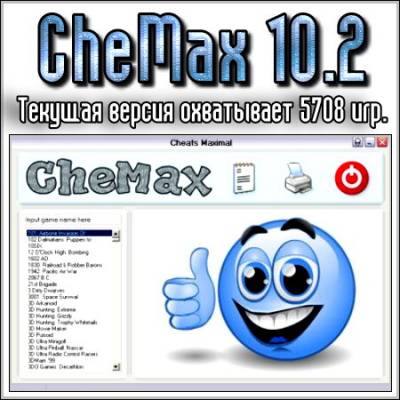 CheMax - очень большая база данных с кодами для игр. База CheMax является прямой наследницей базы программы ChEaTs, которая была существенно дополнена. Особенностю базы является отсутствие в ней хинтов и прочей “отсебятины” - в ней представлены только коды (cheats, hex-cheats) и пароли (passwords).В базе представлены коды к играм, которые были выпущены за последние 10 лет, она являет собой плод шестилетней кропотливой работы. Программа обновляется не реже, чем раз в месяц.Обновлена: сентябрь 2009Операционная система: Windows 98/ME/2000/XP/VistaТип лицензии: FreeWareЯзык интерфейса: RusРазмер: 4.86 Mbскачать/downloadскачать/download
