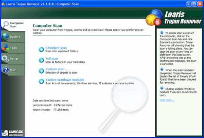 Вас забрасывают popup объявлениями? Видите новую панель инструментов в вашем браузере? Ваша домашняя страница изменяется на нежеланные сайты, или вы забросаны раздражающим спамом? Если Так то Ваш ПК по всей вероятности заражен adware, spyware, spybot, троянами или другими интернет паразитами, которые умеют отслеживать ваши привычки (путем отслеживания запросов, когда вы посещаете сеть интернет) и даже красть такую личную информацию как номера банковского счета и пароли. Loaris Trojan Remover - это программа, с помощью которой Вы сможете целиком очистить свой компьютер от всех агрессивных угроз! Данная версия не требует установки и работает с любого носителя!