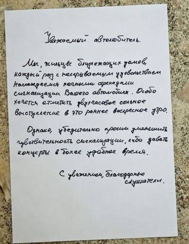 Вот такую записку оставили жильцы соседних домов, одному автовладельцу с плохо настроенно сигнализацией)