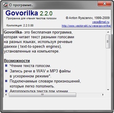 Govorilka - это небольшая программа для чтения текстов голосом. Она может прочитать вслух любой текст, который Вы ей дадите на любом языке, любым установленным голосом. Запишет текст в MP3 файл.