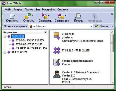 SmartWhois - это удобное средство получения всей доступной информации о любом IP-адресе, имени компьютера или домене, включая страну, штат или провинцию, город, название компании-провайдера, имя администратора и контактную информацию службы технической поддержки.