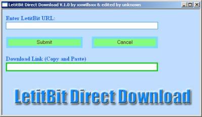 Описание:LetitBit Direct Download - отличная программа для моментального получения прямой ссылки с LetitBit!Для приобретения ссылки, Вы просто копируете обычную ссылку в верхнее окно программы. Нажимате "Submit", и в нижнем окошке появляется прямая ссылка. Которую можно добавить в менеджер закачек (+бонус)
