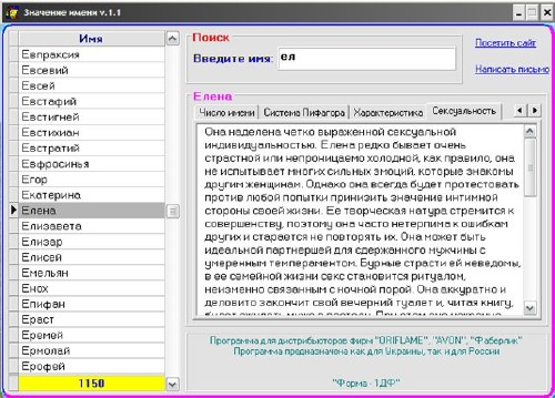 [/center]Значение имени - Программа поможет узнать Вам значение своего имени, вычислит число имени и расчитает квадрат Пифагора. В базе программы содержится более 1000 имен.