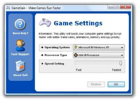 Разработчик популярных утилит для оптимизации работы системы PCBoost, PCMedik и Throttle выпустил еще одну, на этот раз предназначенную для оптимизации системы под игры. Общая черта всех этих программ - крайне простое управление ими, потому что управлять, в общем-то, нечем: настроек пракически никаких, зато есть кнопка "Go", что означает "Поехали!". О том, что происходит после нажатия на эту кнопку, точно известно только разработчику, но система и вправду начинает работать и стабильнее, и шустрее. Что касается GameGain, то у нее такой же элементарный принцип настройки: выбираем операционную систему, потом - тип процессора, затем выставляем ползунком величину ускорения (тут можно поэкспериментировать) и давим на заветную кнопку "Go"...