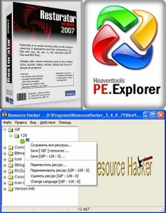 Portable PE Explorer v.1.99 R4 rus, Portable Restorator 2007 v3.70 1747 rus, Resource Hacker 3.14 rus- редакторы ресурсов для многих типов файлов. Программы умеют извлекать ресурсы из файлов EXE, DLL, OCX (Active X), SCR и других, что позволяет самостоятельно создавать и редактировать стандартные файлы ресурсов .res. С помощью этих программ можно рассматривать, извлекать и изменять текст, изображения, значки, меню, диалоги, звуки, мультипликацию и т.п.