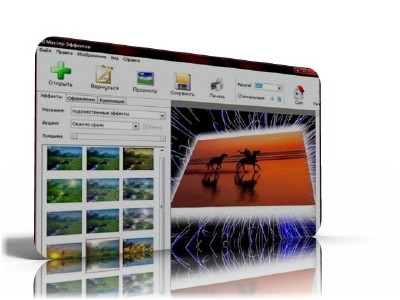 Мастер Эффектов -это новая программа для обработки фотографий при помощи разнообразных фильтров. С её помощью можно полностью преобразить любое изображение. Программа позволяет использовать более 50-ти эффектов, включая как традиционные, так и оригинальные. Вы сможете увидеть свои фотографии на фоне дождя и снега, в тумане и под облаками, добавить солнечный свет или закружить в потоке тайфуна...