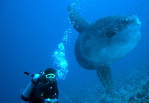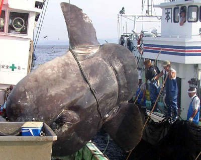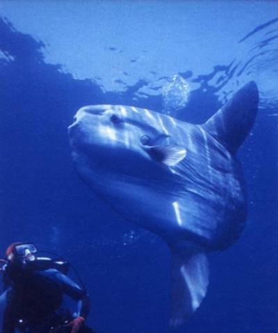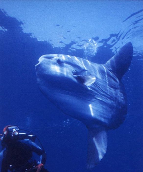 Одна из самых необычных морских рыб! --- Рыба-луна - самая большая костная рыба в мире. Достигает в длину 3-х м и веса 1,5 тонны. У Гиннесса приводятся данные о рыбе, пойманной в 1908 г. недалеко от Сиднея, длина которой составляла 4,26 м, а вес 2235 кг.