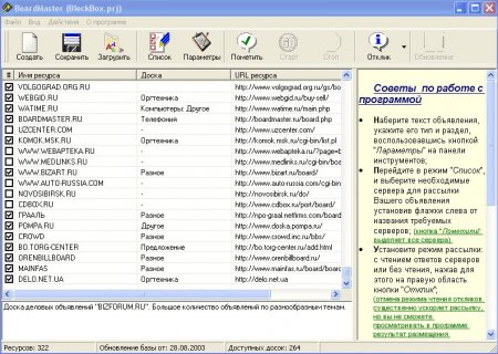 Русская программа для авто размещения рекламных объявлений на электронных досках в Интернет. BoardMaster очень удобна в эксплуатации. Да, и что совсем уникально работает обновление баз с сайта написавшего эту программу. BoardMaster Pro 2.2 (свежая база на 450 досок, 5000 разделов) Программа размещает информацию в автоматическом режиме более чем на 450 досок объявлений. Практически все крупные русскоязычные сервера, имеющие доски объявлений входят в базу. Детальная структура каталога разделов позволяет максимально точно позиционировать тематику размещения объявлений. Есть возможность отправлять объявление в несколько разделов одновременно. Простой и эффективный интерфейс позволит в короткие сроки освоить работу с программой. Предоставляется детальная статистика и возможность просматривать ответы серверов для контроля за размещением. Позволяет самостоятельно добавлять доски объявлений. Визуальный конструктор обеспечивает простоту работы и не требует специфических знаний. Встроенные технологии распознавания форм и разделов намного ускоряют добавление новых ресурсов.