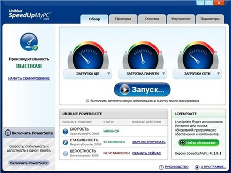 SpeedUpMyPC - программа для ускорения работы компьютера. По заявлению разработчиков увеличивает скорость даже на самых мощных машинах. SpeedUpMyPC автоматически определяет наилучшие настройки для вашего компьютера и управляет системными ресурсами, обеспечивая лучшую производительность. При помощи SpeedUpMyPC вы сможете делать очистку системы, следить за использованием ресурсов и ускорять быстродействие.SpeedUpMyPC позволяет контролировать и управлять всеми ресурсами компьютера одним простым щелчком мыши. Системные настройки, интернет использование, беспорядок на диске, оперативная память и центральный процессор, все будет автоматически просканировано, очищено и оптимизировано для достижения максимальной производительности. Вы можете также остановить или удалить фоновые и процессы автозагрузки, произвести качественную дефрагментацию диска и многопроходной зачисткой, для соблюдения приватности, полностью удалить чувствительные данные и многое другое.Особенности программы:- Автоматическое сканирование производительности системы- Обзор использования центрального процессора- Повышение функциональности процессора- Обзор использования оперативной памяти- Оптимизация ОЗУ- Обзор использования дискового пространства- Анализ и дефрагментация жестких дисков- Анализ и оптимизация скорости интернет соединения- Менеджер автозапуска- Диспетчер задач- Обзор системы и рекомендации по увеличению её производительности- Сканирование на ненужные или нежелательные данные- Полное уничтожение конфиденциальных данных (по желанию)- Менеджер по удалению программ- Приятный и удобный пользовательский интерфейс- Запуск программы при старте системы (по желанию)- Автоматический запуск сканирования системы при загрузке программы (по желанию)- Запуск программы в системном трее- Иконка программы в системном трееПри установке русификатора удалите прогу из трея!!!Название: SpeedUpMyPC 2009 v.4.1.0.1 Build 0609Размер: 2.45 МБЯзык Интерфейса: РусскийПлатформа: Windows® 2000/XP/2003/VistaГод выпуска: 2009 Активация: В архивеSpeedUpMyPC 2009 v.4.1.0.1 Build 0609